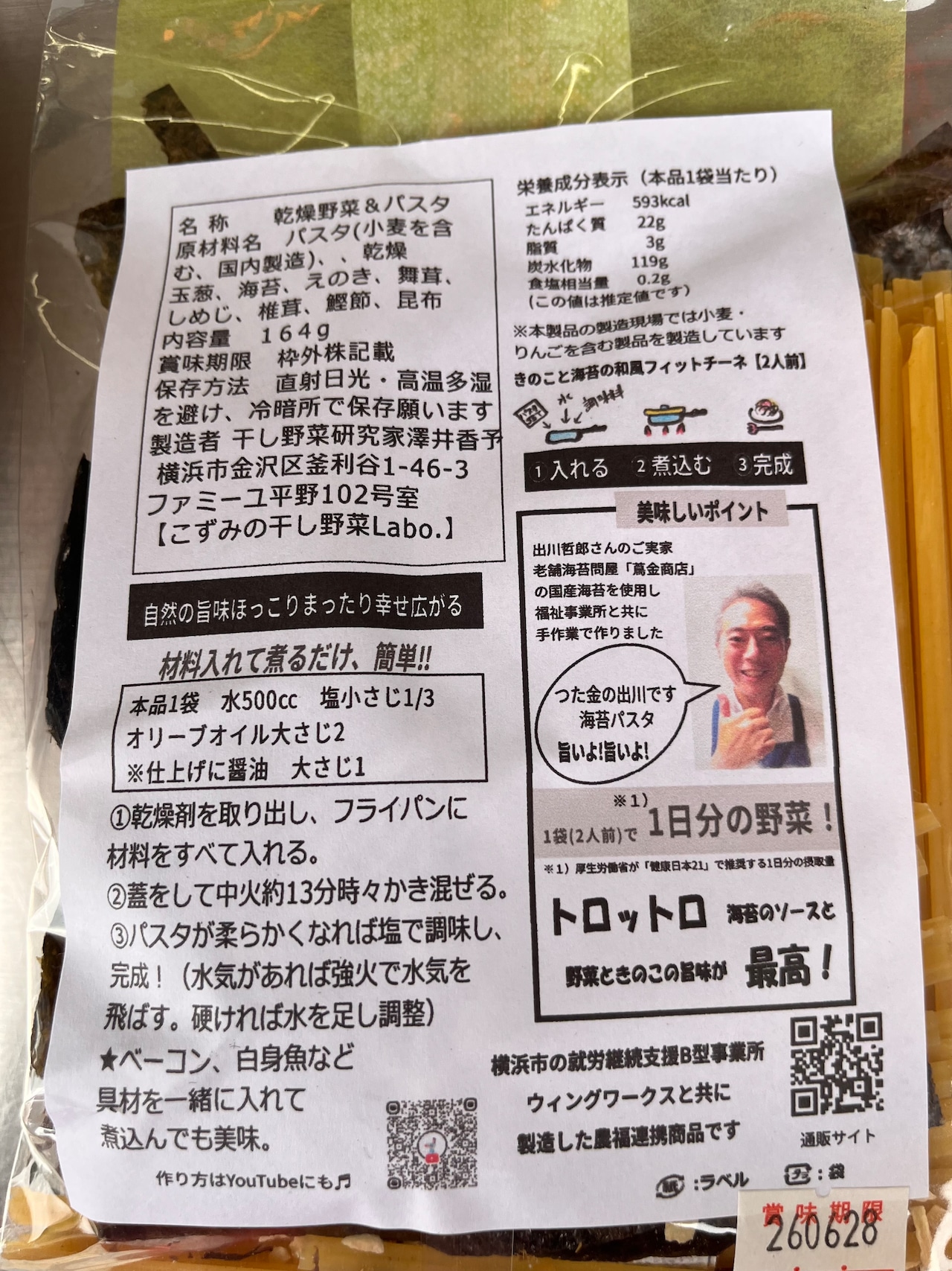 【原材料】パスタ(小麦を含む、国内製造)、乾燥きのこ、海苔、長ねぎ、玉ねぎ、椎茸、鰹節、昆布