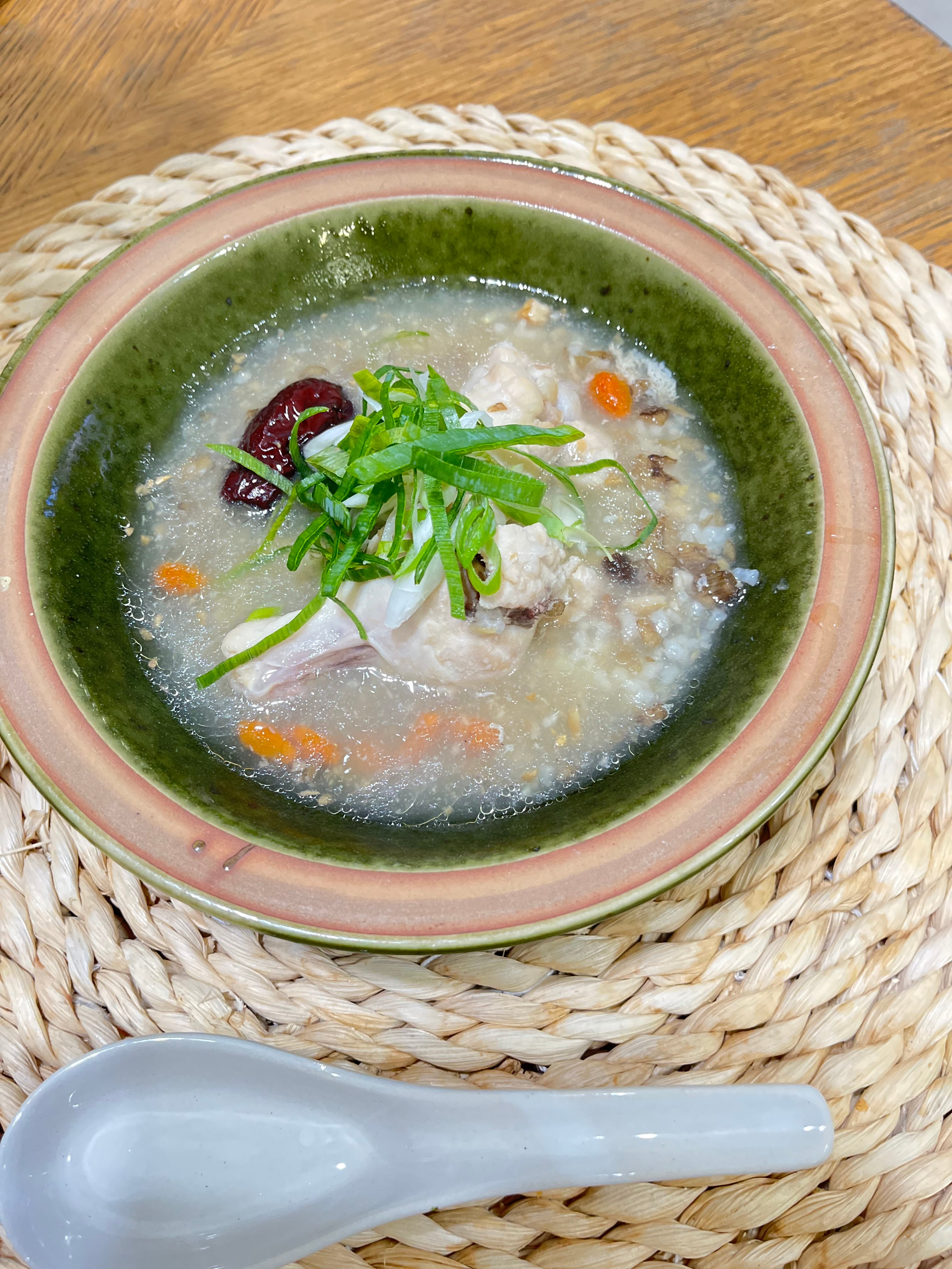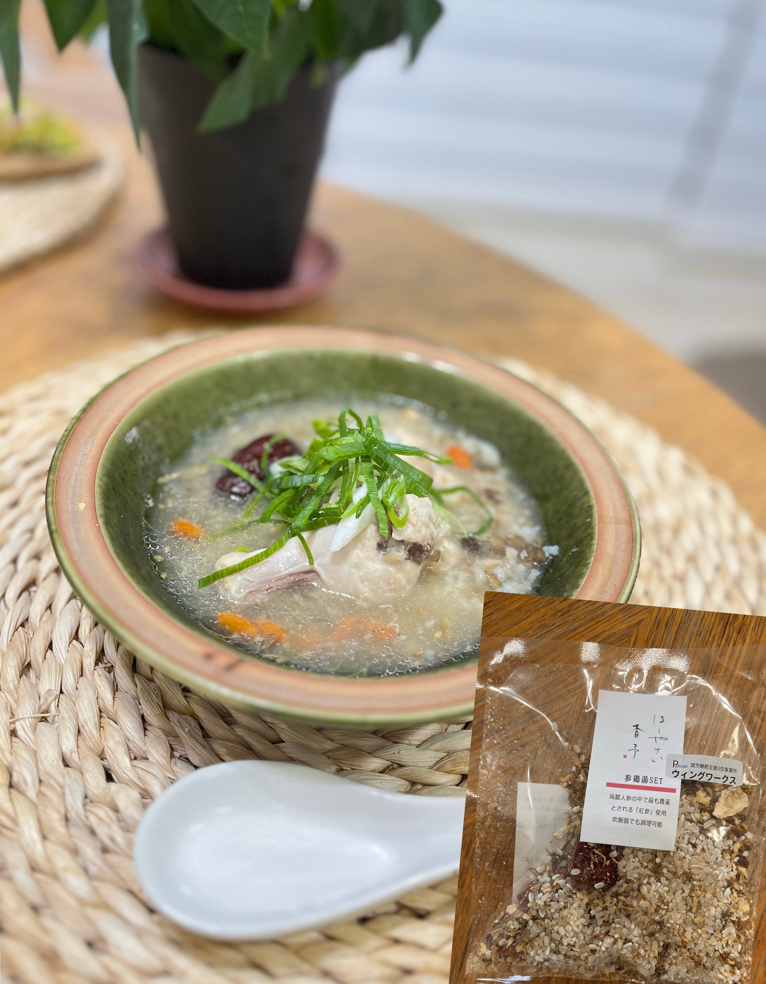 横浜市緑区の緑園で、ダブルタッチ世界王者が育てたもち米。国産ごぼう、国産にんにく、国産生姜、国産椎茸を横浜市金沢区の【ほしやさい香予】のラボで就労継続支援B型事業所ウィングワークスのみんなと心をこめて乾燥させ製造したYOKOHAMA溢れた参鶏湯です。